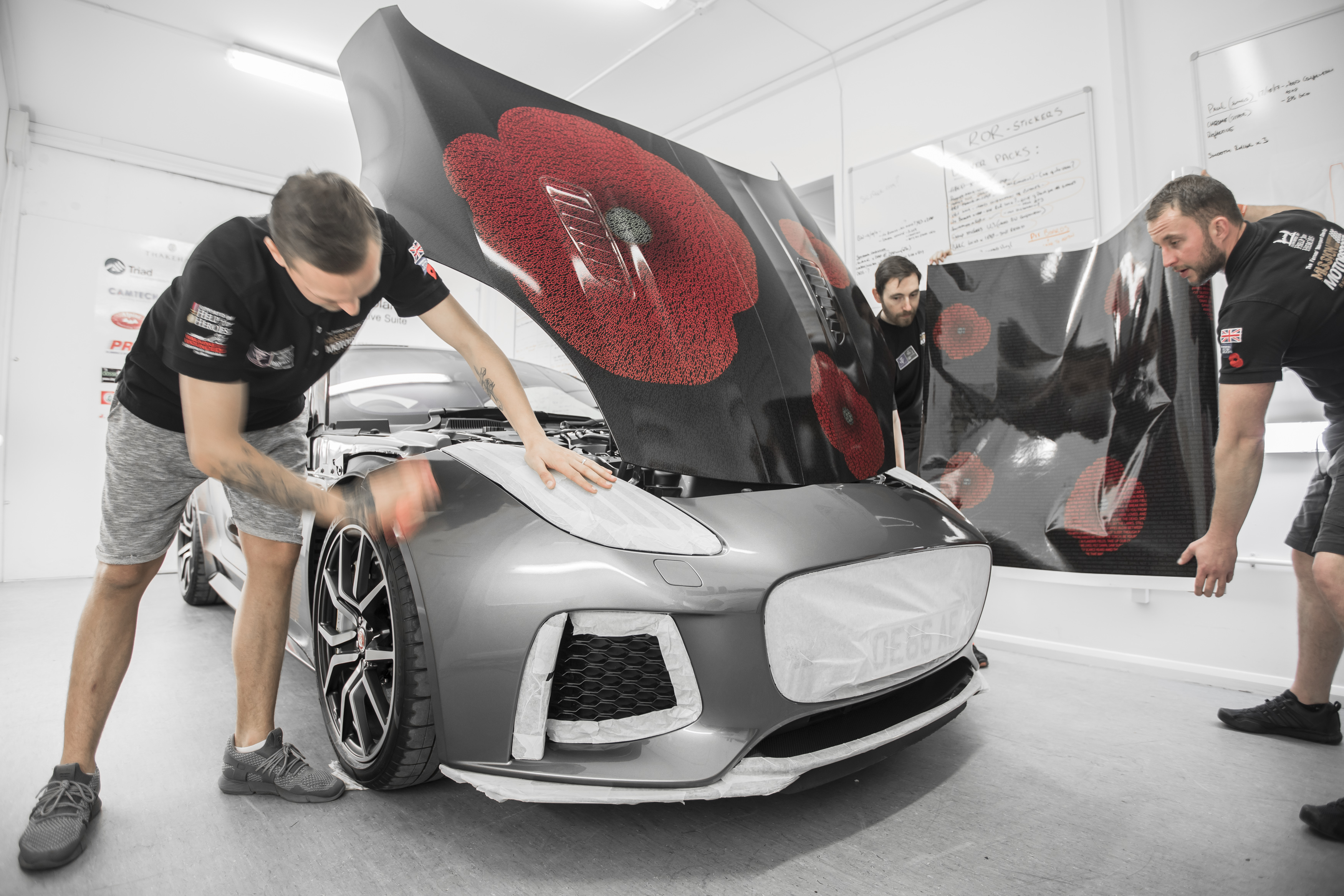 Fahrzeugwrap mit Mohnblumen zum Totengedenktag von Mission Motorsport