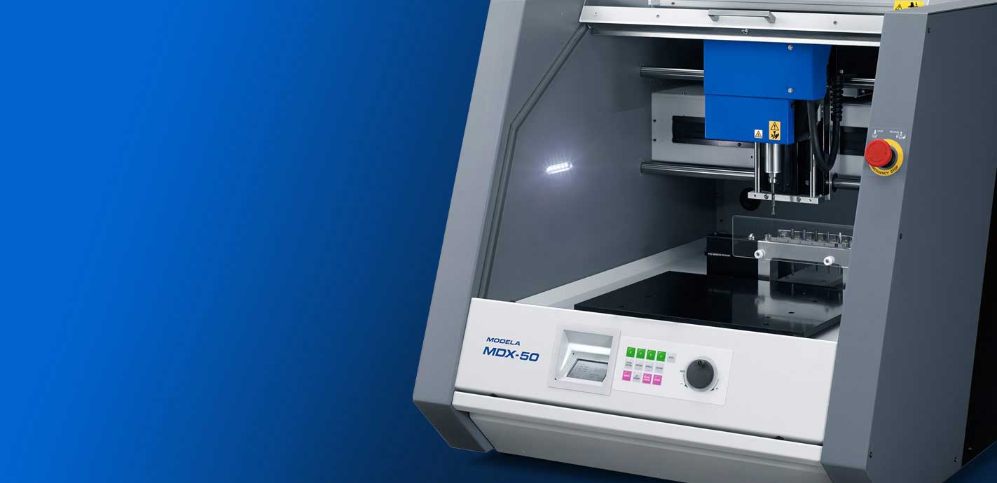 Die MDX-50 erhöht die Leistung durch einen erweiterten Arbeitsbereich und beschleunigt die Arbeitsgeschwindigkeit durch schnellere Auftragsbearbeitung und den automatischen 5-fach Werkzeugwechsler. Der Betrieb muss nicht unterbrochen werden, um Fräser zu wechseln.