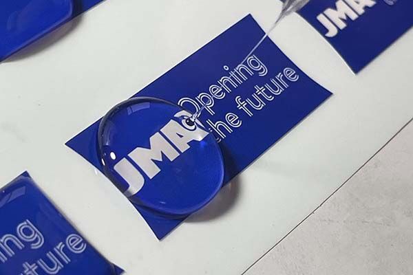 Jedes Etikett ist mit einer Schicht aus hochwertigem, transparentem Polyurethan-Kunstharz überzogen. Dieses Harz, das in zweiteiligen Kartuschen gelagert ist, sorgt dafür, dass der Katalysator bis zur Anwendung getrennt ist. Der Katalysator leitet den Aushärtungsprozess ein und bringt das Harz auf die Etiketten auf. Das Ergebnis ist eine strapazierfähige, glänzende Kuppel, die das Logo oder Design aufwertet, die Schlüsselidentifikation erleichtert und gut zu greifen ist.