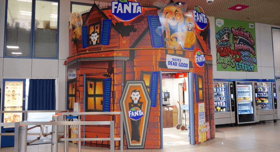 The Christmas campaign follows a Halloween project for the same client, which saw the Europa Buscentre kiosk turned into a spooky haunted house. Featuring a skull graphic that imitated a shelf wobbler with red eyes lit with LEDs, the project also included Fanta logos installed 15mm off the wall with an impactful halo LED lighting effect.