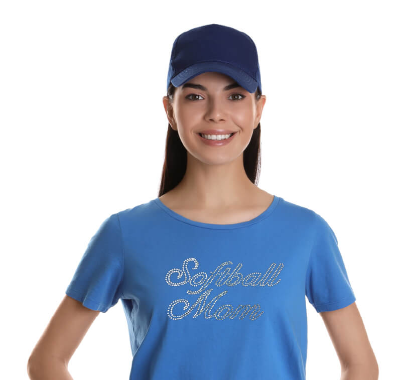 A woman wearing a t-shirt with rhinestone decoration