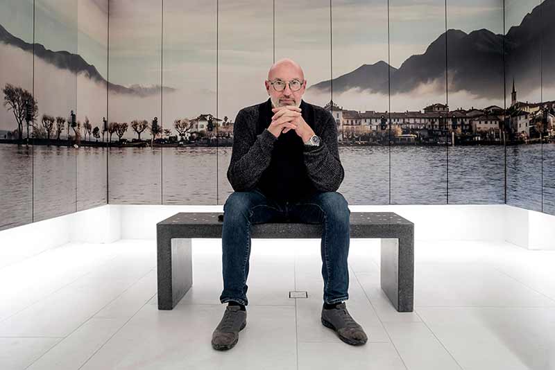 The photographer Walter Zerla, surrounded by his photo panels made with Roland LEC2 S flatbed UV printer for an exclusive spa in Stresa on Lake Maggiore.