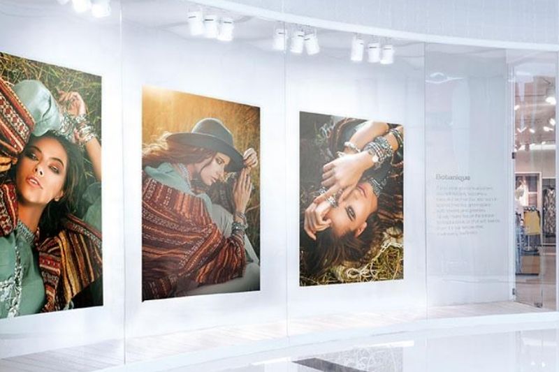 Nuestras impresoras eco-solventes ofrecen una increíble gama de colores, desde el verde y el naranja hasta el blanco y los colores metalizados, como este póster de un mostrador de productos de maquillaje.