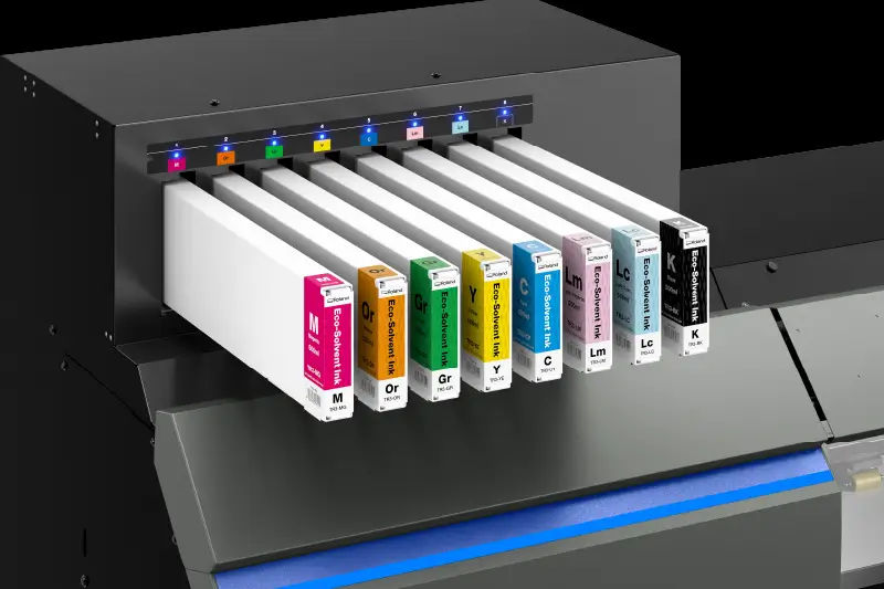- Impresión de colores excepcionales llenos de vida con las nuevas tintas ecosolventes TR3, disponibles en configuraciones de doble CMYK u 8 colores que ofrece la gama más amplia, incluidos naranja, verde y blanco.