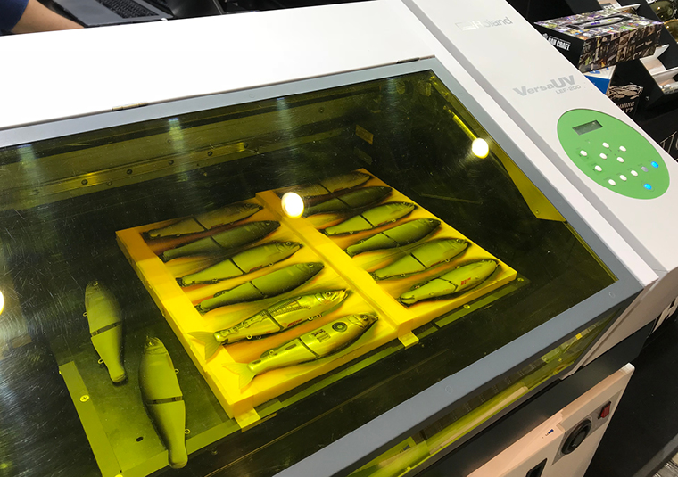 À l'image de ces leurres qui tiennent dans la paume de la main, les produits de ce type peuvent être imprimés à l'unité ou par lot d'une dizaine de leurres (ou plus) en utilisant un gabarit, chaque pièce comportant des attributs uniques. Gan Craft a même amené sa VersaUV LEF au salon de la pêche Fishing Show Osaka, événement majeur du secteur de la pêche où les visiteurs ont pu découvrir de nombreux équipements et des informations sur la pêche à la ligne.
