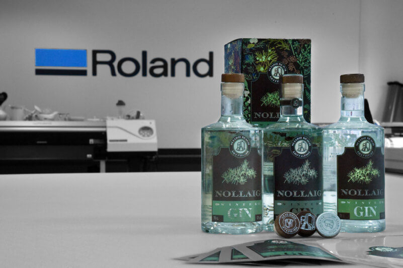 Étiquette pour une bouteille de gin créée avec une imprimante/découpeuse UV