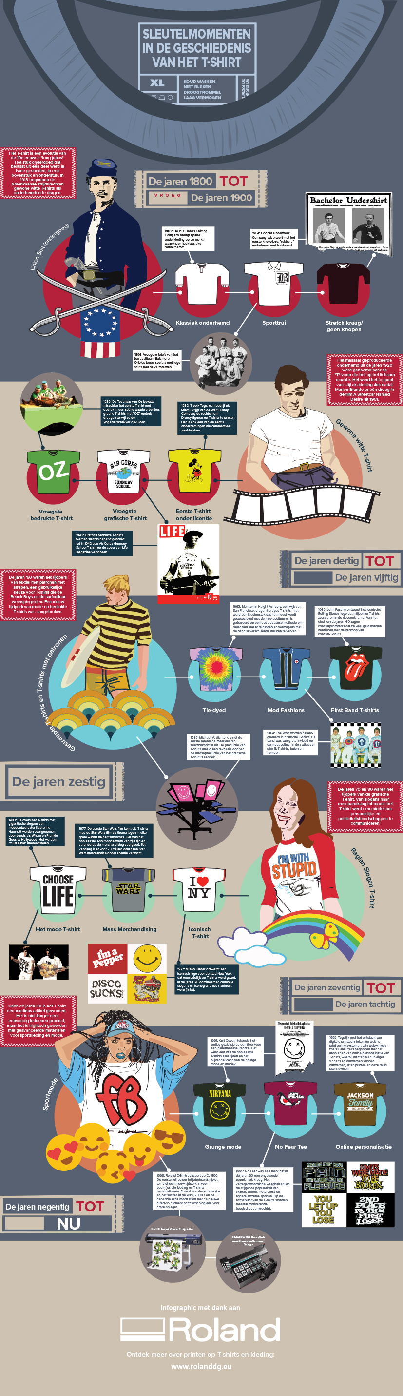 Deze infographic van Roland DG neemt u mee op de fascinerende en kleurrijke reis van het T-shirt en toont de grote momenten in de geschiedenis van het T-shirt, die het tot een kledingstuk hebben gemaakt dat wereldwijd in alle kleerkasten ligt. Misschien doet u wel inspiratie op voor uw eigen print!