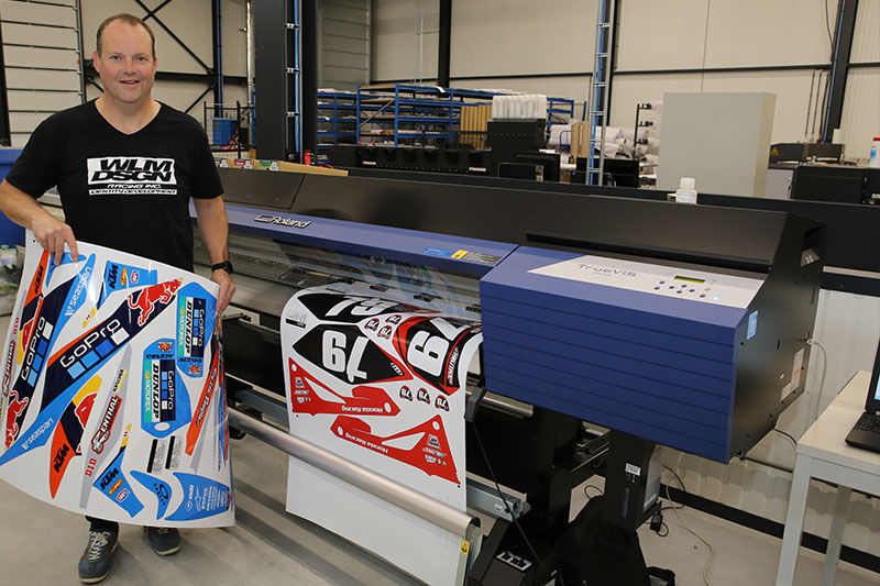 Lamers zag dus al vroeg de voordelen van digitale productie, ook voor stickers. In 2005 was WLM na veel pionierswerk een van de eerste stickerproducenten die de ‘dikke’ MX-stickers - “die printfolie wordt volgens mijn specificaties gemaakt in de Verenigde Staten” - per stuk digitaal kon produceren. De laatste jaren gebeurt dat op een Roland VersaExpressRF-640, voorzien van acht kleuren. Sinds januari 2020 staat daar de nieuwe Roland TrueVIS VF2-640 naast; een 1,60 meter brede printer voor het middensegment. “Ik was verrast dat ik werd benaderd om als bèta-site te fungeren. Een unieke ervaring waarvan ik veel heb geleerd.”