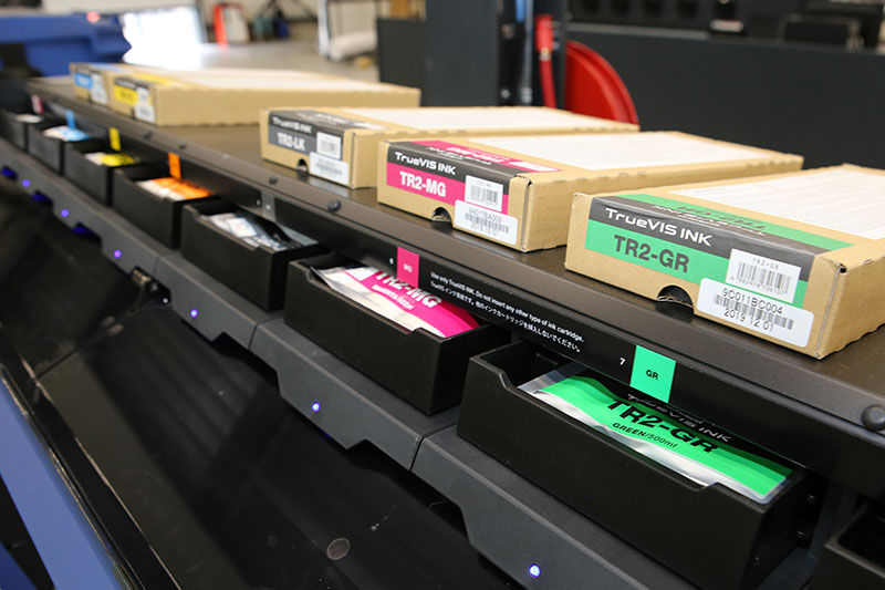 De TrueVIS VF2-640 heeft acht kleurkanalen, waarbij de kleuropties groen, oranje en wit het meest opvallend zijn. WLM gebruikt de configuratie zonder witte inkt. “Want wij printen alleen maar op de speciale witte MX-folie.” Lamers roemt het kleurbereik van de TR2-inkten waarmee de TrueVIS VF2-640 is uitgerust. “Een heel breed kleurenspectrummet briljante, verzadigde volvlakken. Belangrijk, want wij printenvrijwel alleen vectorbestanden en nauwelijks fotorealistische afbeeldingen.”
