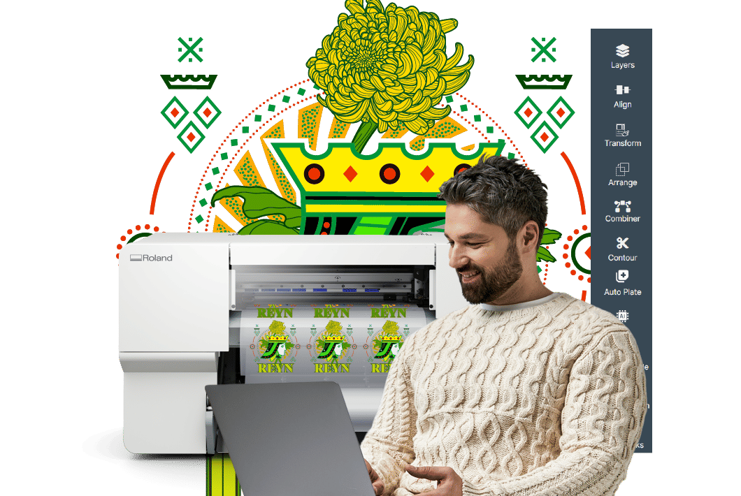 Przejmij kontrolę nad projektem pliku dzięki Roland DG Connect Designer: Visual Communication Module. Twórz i doskonal gotowe do druku grafiki do codziennej produkcji. Wyczyść grafikę, usuń tła i wektoryzuj obrazy - dzięki temu możesz szybciej przygotowywać pliki, utrzymywać stałą jakość i swobodnie wysyłać zadania do wydruku, gdziekolwiek jesteś.