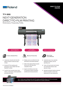 A TY-300 faz parte da solução DTF completa da Roland DG, com software RIP, película e pó DTF e uma unidade de agitador/aquecedor opcional para a produção automatizada de transferência DTF.
