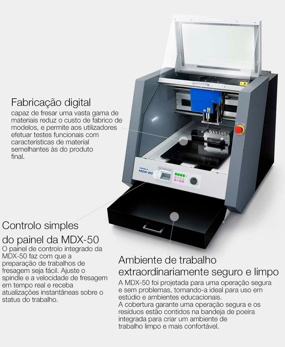 - A MDX-50 é compatível com a linguagem de programação G-code NC, pelo que é muito adequada, tanto para aplicações profissionais quanto educativas.