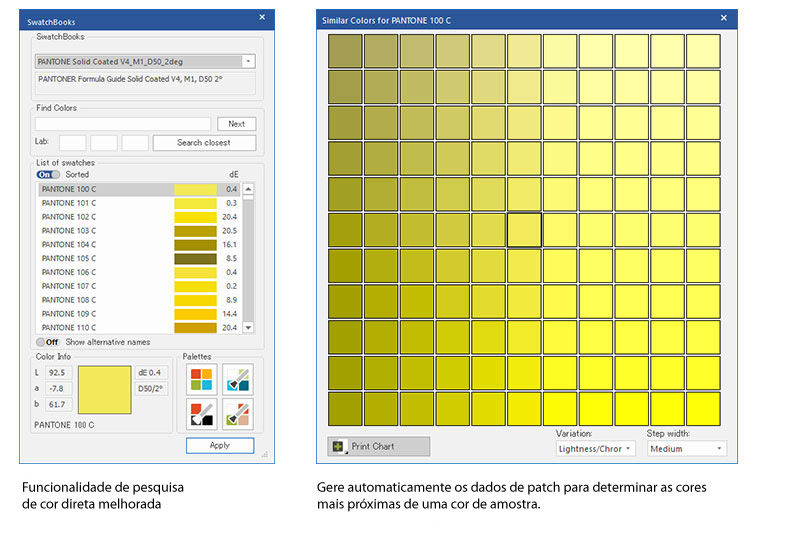 Quando as cores reais impressas diferem da cor direta esperada, a nova funcionalidade Patch Generation gera automaticamente cores mais aproximadas da cor direta. Os utilizadores podem então selecionar a cor desejada a partir das alternativas impressas para alcançar os resultados pretendidos mais rapidamente.